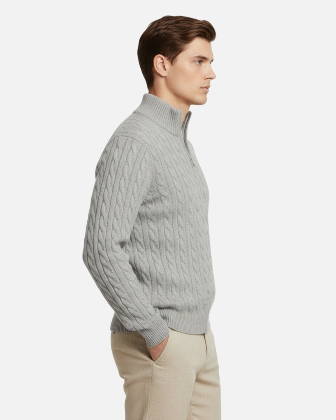 Een verfijnde half-zip trui met kabelstructuur, vervaardigd uit een zachte wolmix die warmte en comfort in balans brengt, met een licht elastische kraag en subtiele ritssluiting die een moderne uitstraling geven. De natuurlijke tint straalt rust en tijdloze elegantie uit, ontworpen voor dagen waarop verfijning en eenvoud moeiteloos samenkomen, als een stille expressie van comfort en stijl.